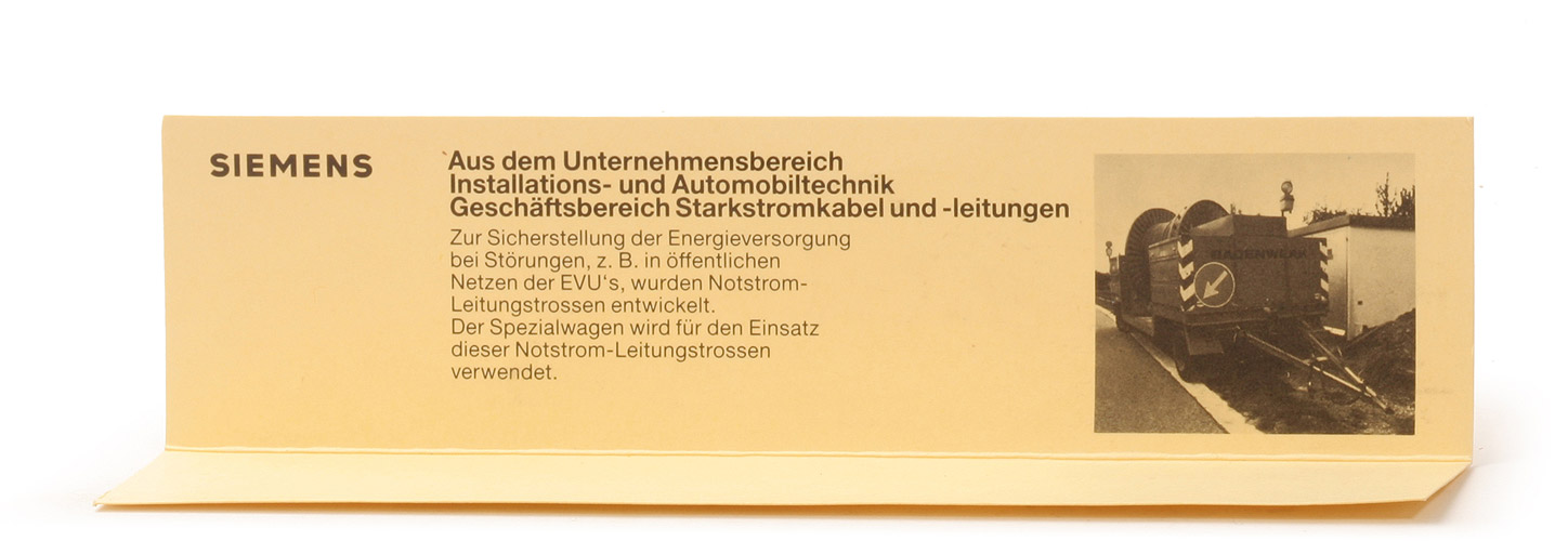 Siemens-Werbemodell mit Thermodruck auf der Trommel. Hier Kabel orangerot, Trommel ca. braungelb. Bei diesem Modell gibt es ein sehr seltene Werbeeinlage mit einem Anhänger - siehe Bild.