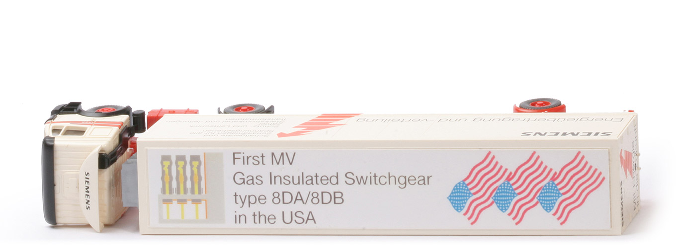 Mit Spoiler in weiß (mit Bedruckung "Siemens") und Sonnenblende in schwarz. Die Türen des Aufbaus sind nicht zu öffnen und mit Siemens-Werbung bedruckt: "Siemens - Mit Energie in die Zukunft". Der Koffer trägt vorne ein silbernes Kühlaggregat. Selten: hier mit Dachaufkleber "... in the USA". |
