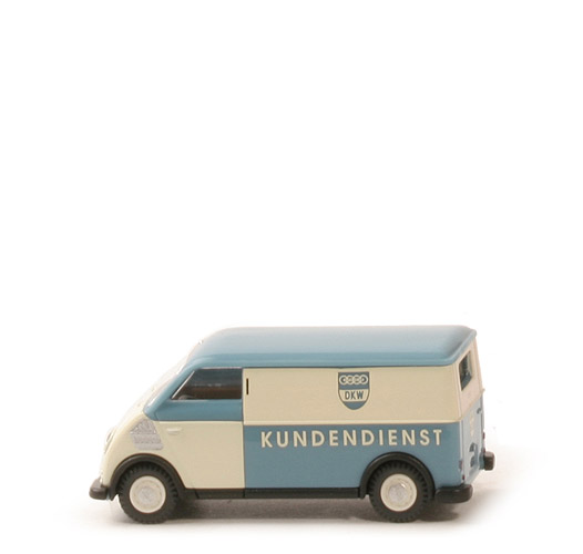 Beschriftung durch die Schablonierung seitlich oben Negativdruck DKW-Logo, "DKW" in Wappen, unten Positivdruck "Kundendienst" und hinten das Wappen in Negativdruck. Offizielle Farbangabe "pastellblau". |
