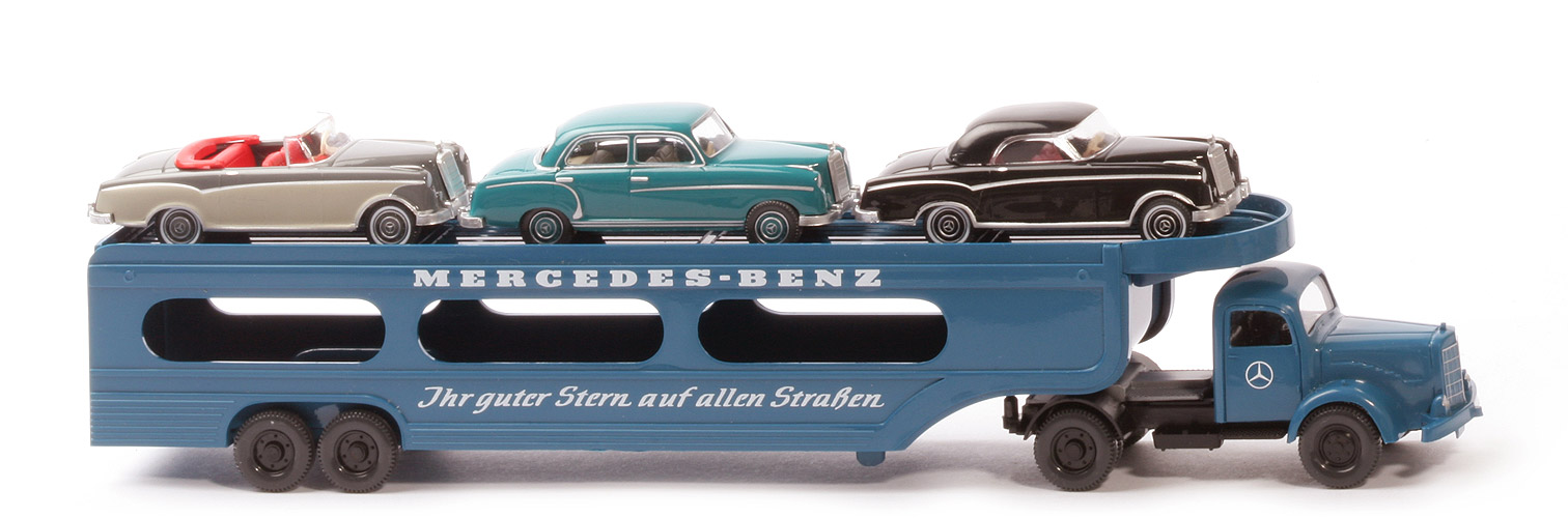 Aus der Packung "Die Großen Ponton-Mercedes" aus der Reihe "Meilensteine der WIKING-Geschichte". Der Auflieger trägt den Druck "Mercedes-Benz" und "Ihr guter Stern auf allen Straßen". Dazu gibt es in der Packung eine passende Auffahrrampe.