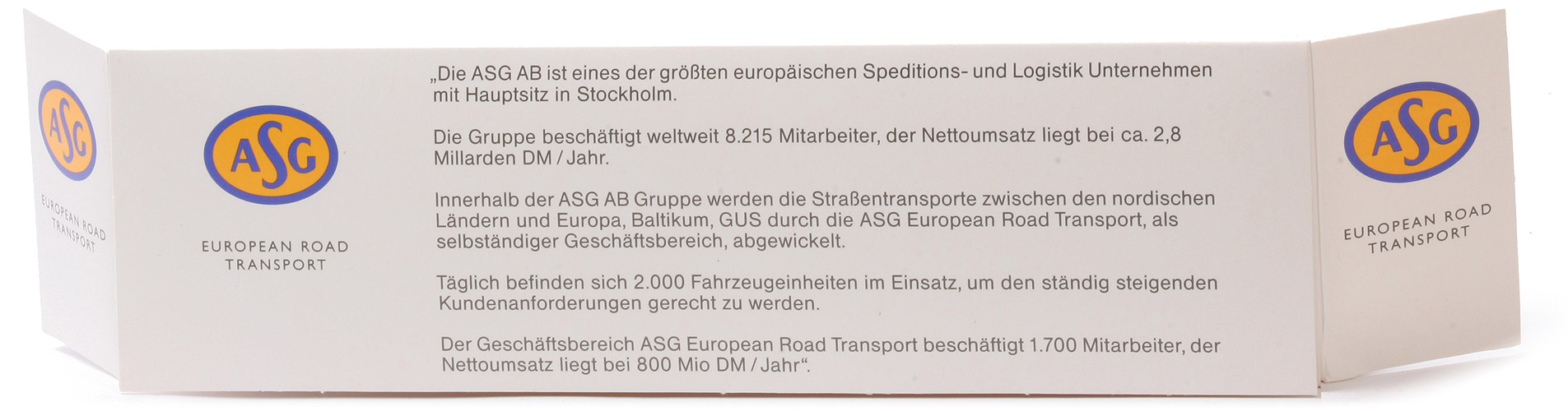 Wie in GK beschrieben: Modell wie Serienmodell. Hier in Werbeschachtel. Druck auf den Stirnseiten der Werbeeinlage: ASG-Logo, "European Road Transport".