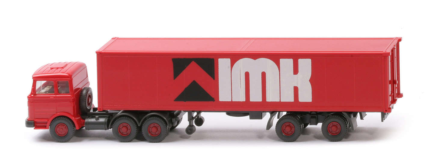Gelistet im GK als Koffersattelzug. Es handelt sich hierbei um den verklebten Glattwandcontainer ohne seitliche Türen. Die rote 2223-Kabine gibt es nur beim Schieder. Modelle mit Spiegeln und ohne Scheibenwischer sind zeitlich zwischen 1978 und 1981 einzuordnen.