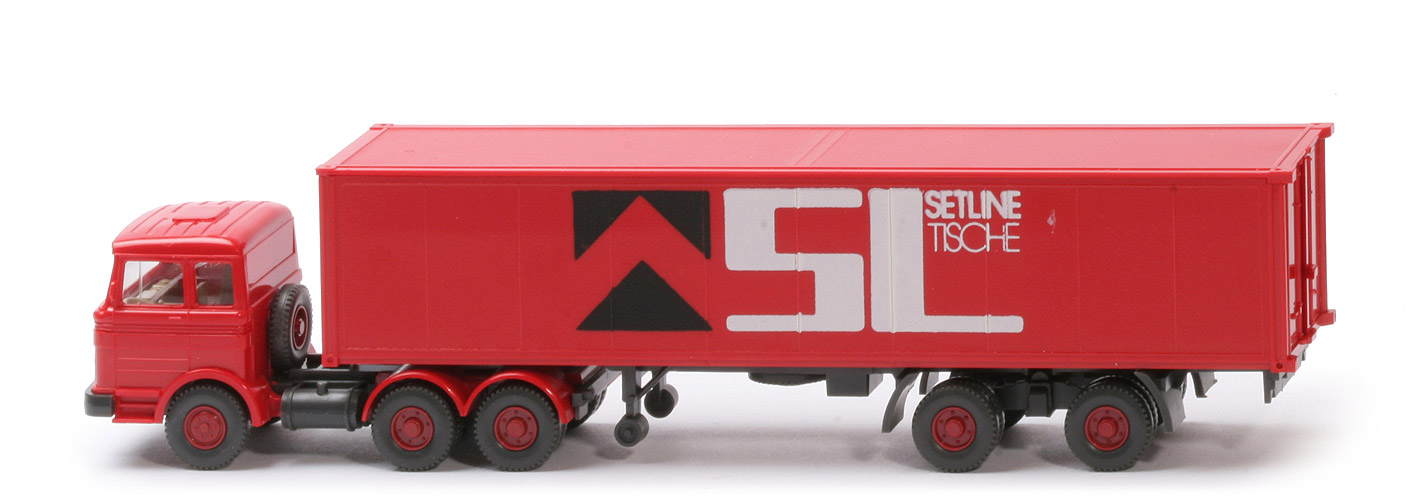 Gelistet im GK als Koffersattelzug. Es handelt sich hierbei um den verklebten Glattwandcontainer ohne seitliche Türen. Die rote 2223-Kabine gibt es nur beim Schieder. Modelle mit Spiegeln und ohne Scheibenwischer sind zeitlich zwischen 1978 und 1981 einzuordnen. |