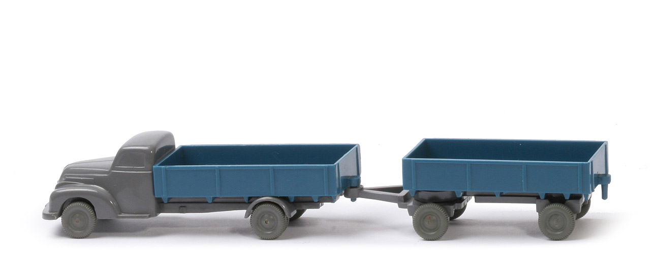Azurblaue Pritschen sind dem GK nicht bekannt. Unten Bild mit passendem Zugwagen. Diese Pritschen ohne seitliche Struktur für die unverglasten Modelle in der Farbe azurblau sind selten anzutreffen. |