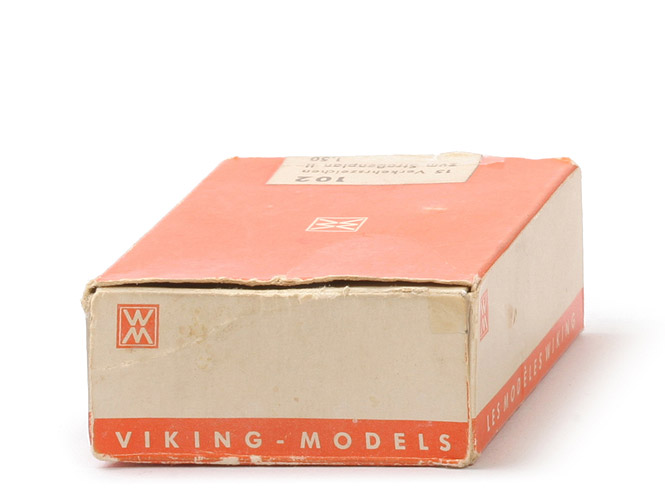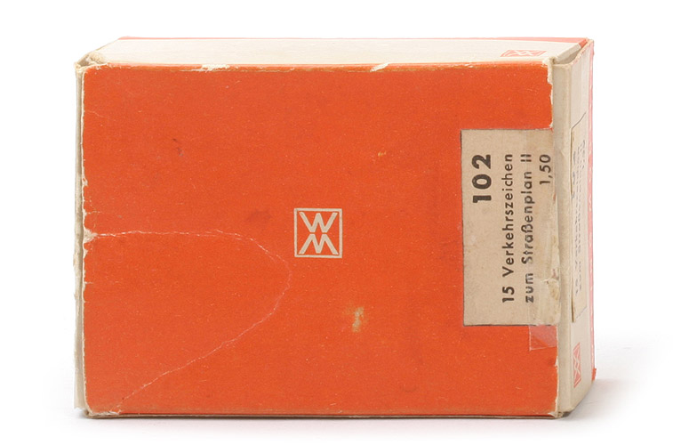 Dieses Verkehrsschilder-Set beinhaltet die Schilder, die auf den WIKING-Straßenplan II aufgedruckt sind. Ein solches Set gab es von 1960 bis 1970: laut Preislisten 1960 und 1961 im Beutel und ab 1962 im Karton. Hier im Karton ohne Druckvermerk. |