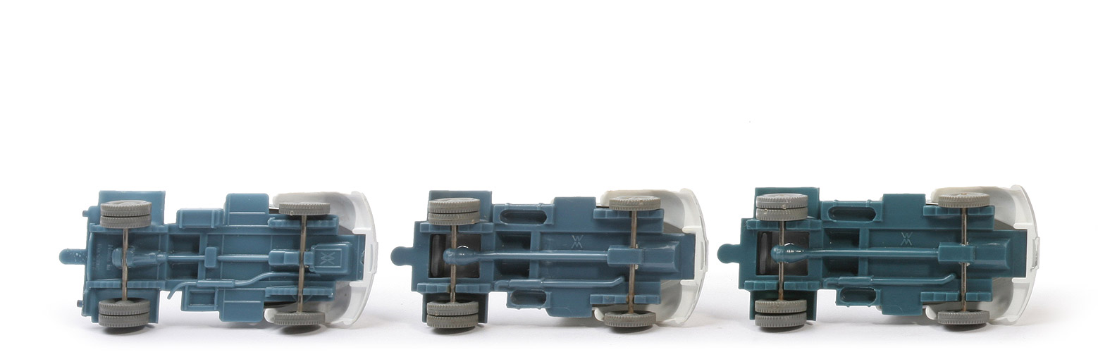 Das Chassis in dunkelgraublau ist seltener als das in mattgraublau. Unten ein Bild der 3 Chassis-Versionen. Von rechts nach links: dunkelgraublau AH geschlossen, mattgraublau AH geschlossen, mattgraublau AH offen.