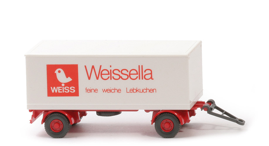 Offenbar handelt es sich hier um eine derartige Fälschung. Die Bauteile sind in Farbe und Ausführung prinzipiell so, wie sie seien sollten, jedoch weicht der Druck gegenüber dem Anhänger des Werbemodells Weiss (2) deultich ab: anderes Druckbild und dick aufgetragene hochglänzende Farbe. Ein Bild des Anhängers zum Vergleich unten.