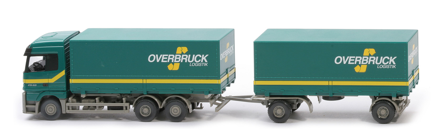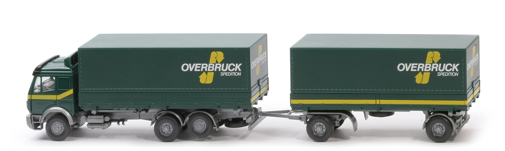 Das erste Overbruck-Modell aus 1992 mit der MB 2538 SK - Kabine. Die Pritschen tragen an der unteren Kante seitlich und hinten einen gelben Streifen. Bei vorliegenden Exemplar fehlt dieser Streifen beim Zugwagen auf der Fahrerseite (Fehldruck).