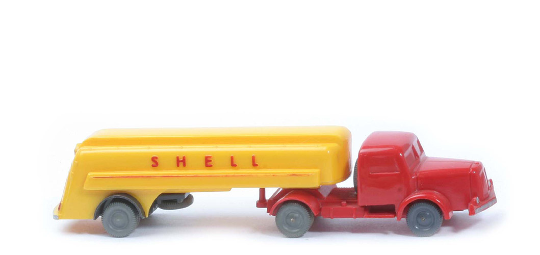 | Achsen | Rollachser | | | Zugmaschine | | Farbe Kabine | blassrot | | Farbe Chassis | blassrot | | Bemalung | Scheinwerfer, Stoßstange | | Sattelpfanne | eingesetzt, in Chassisfarbe | | Chassis | Version 1a | | Achshalterungen | geschlossen | | Bodenprägung | WM im Kreis | | Reserverad | hinter Kabine | | Räder | 10mm, ältere Ausführung | | | Auflieger | | Farbe Oberteil | gelb | | Farbe Unterteil | gelb | | Farbe Achseinheit | anthrazit | | Königsbolzen | integriert, mit Ring | | Position Königsbolzen | zentral auf Aufnahmeplatte | | Bodenprägung Auflieger Chassis | ohne | | Achshalterungen | geschlossen | | Bodenprägung Achseinheit | WM im Kreis | | geprägter Streifen | schmal | | Beschriftung | Shell (s. Foto) | | Beschriftung Art | geprägt, ohne Heckbeschriftung | | Bemalung Rückleuchten | rot | | Bemalung Stoßstange | silber | | Räder | 10mm, ältere Ausführung |