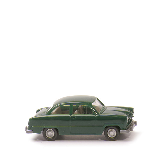 Farbe Karosserie | kieferngrün | Inneneinrichtung | ca. graubeige | Lenkrad | integriert | Bemalung Scheinwerfer | silber | Bemalung Rückleuchten | ohne | Chassis | silbern | Bodenprägung | Ford 12M, WIKING, Berlin-W | Räder Art | Riffelkappe, gesilbert |