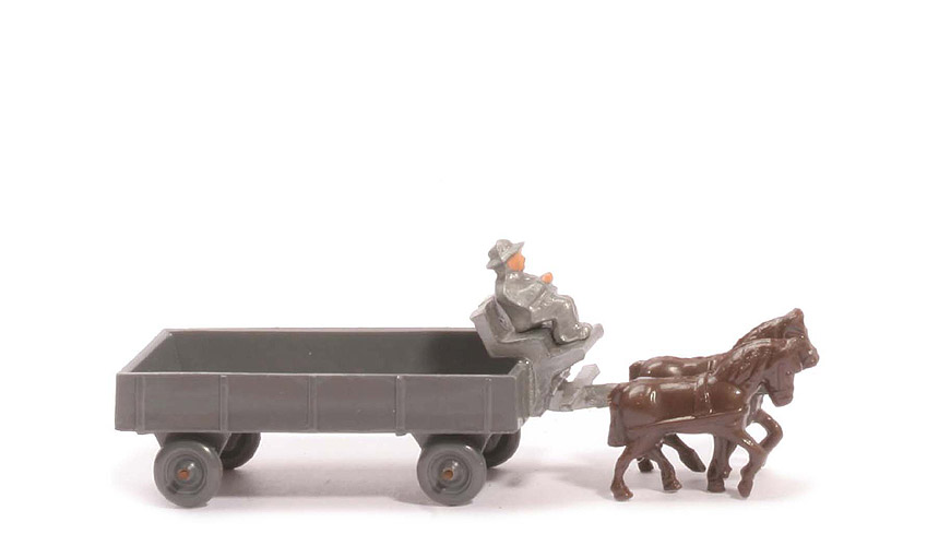 Räder | Drahtachser | Pritschentyp | ohne Querverbretterung | Farbe Pritsche | basaltgrau | Deichselrest | ohne | Pritschenboden | mit Struktur | Zughaken | ohne | Deichsel/Kutschbock | silbern | Quersteg Deichsel | mit | Farbe linkes Pferd | ca. braun (dunkel) | Farbe rechtes Pferd | ca. braun (dunkel) | Kutscher Typ | Hut | Kutscher Farbe | silbern (!) | Kutscher Bemalung | Gesicht, Hände | Räder | ca. basaltgrau |