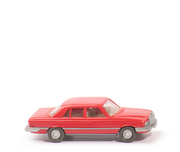 | Farbe Karosserie | rot | | Grill | silbern, Teil des Zwischenelementes | | Stoßstangen, umlaufende Leiste | silbern | | Farbe Schürze | rot | | Verglasung | klar, mit Wischern u. Innenspiegel | | Inneneinrichtung | ca. gelbgrau, integriertes Lkr | | Chassis | silbern | | Bodenprägung | Mercedes/450 SE/WIKING/Berlin-W | | Bemalung Rückleuchten | ohne | | Räder Art | Riffelkappe | | Felgen | gesilbert |