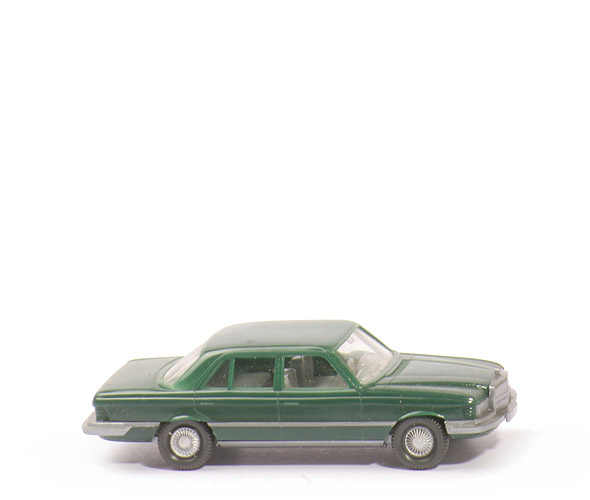 | Farbe Karosserie | kieferngrün | | Grill | silbern, Teil des Zwischenelementes | | Stoßstangen, umlaufende Leiste | silbern | | Farbe Schürze | kieferngrün | | Verglasung | klar, mit Wischern u. Innenspiegel | | Inneneinrichtung | ca. silbergrau, integriertes Lkr | | Chassis | silbern | | Bodenprägung | Mercedes/450 SE/WIKING/Berlin-W | | Bemalung Rückleuchten | ohne | | Räder Art | Riffelkappe | | Felgen | gesilbert |