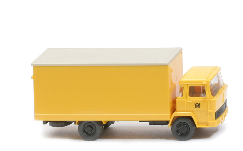 Farbe Kabine | gelb | Spiegel/Wischer | mit | Verglasung | klar | Grill | schwarz eingesetzt | Bemalung | ohne | Inneneinrichtung | 2 Sitze, Motorblock | Armaturenbrett, Lenkrad | mit | Farbe Innenrichtung | ca. gelbgrau | Chassis Farbe | schwarz | Bodenprägung | GERMANY, WM | Zughaken | ohne | Reserverad | hinten unter Chassis gesteckt | hinterer Kotflügel | gelb | Aufbau Typ | hoher Koffer | Farbe Koffer | gelb | Farbe Ladebordwand | gelb | Farbe Kofferdach | hellelfenbein | Koffer Bodenprägung | WIKING BERLIN-W | Beschriftung | stilisiertes Horn auf Tür | Beschriftung Art | Druck | Räder | 11mm, Felge eingesetzt | Felgenfarbe | schwarz |