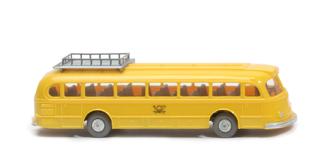 Verglasung | mit | Farbe Karosserie | gelb | Dach Mittelbereich | mattiert mit Lüftern | Kombination Dach/Gepäckbrücke | Kombination 4 | Verglasung | klar | Sitze | ca. braunmetallic | Fahrer | beige | Lenkrad | 4-speichig | Heck | mit angedeuteter Kupplung | Gepäckbrücke | silbern, ohne Steg | Chassis Farbe | basaltgrau | Chassis Typ | Struktur, BP WM | Bemalung vorne | Scheinwerfer, Stoßstange silbern | Bemalung Heck | Rückleuchten rot, Stoßstange silbern | Beschriftung | Posthorn groß (6mm) | Beschriftung Art | Druck | Räder | 12mm, einteilig | Radkappen | silbern bemalt |