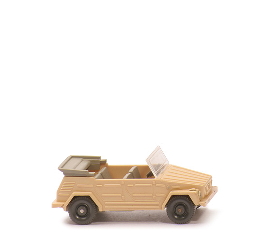 | Farbe Karosserie | hellbeige | | Windschutzscheibe | klar, eingeklebt | | Inneneinrichtung | hellolivgrau | | Abdeckung Verdeck | hellolivgrau | | Lenkrad | 3-speichig, separat eingesetzt, anthrazit | | Chassis Farbe | hellolivgrau | | Bodenprägung | VW 181 Wiking Germany | | Bemalung vorne | Scheinwerfer silbern | | Bemalung hinten | ohne | | Räder | 8 mm, Nabe flach, unbemalt |