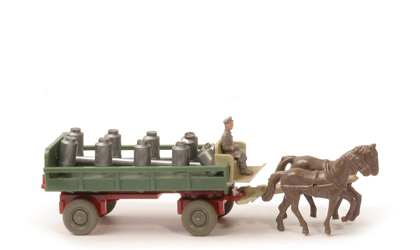 Typ | Rollachser | Farbe Pritsche | diamantgrün | Pritschentyp | mit Rückleuchten und hinterem Kennzeichen | Chassis | hellbraunrot, mit Zughaken, Normchassis Typ 5 | Chassis Bodenprägung | WIKING, Germany | Drehschemel | hellbraunrot | Befestigung Drehschemel | Bajonettverschluss | Achshalterungen | offen | Kutschbock | hellgelbgrau, verstärkte Vorderkante | Deichsel | hellgelbgrau, neue Befestigungs-Konstruktion | Farbe linkes Pferd | ca. blassbraun | Farbe rechtes Pferd | ca. blassbraun | Kutscher Farbe | ca. staubgrau | Kutscher Bemalung | Gesicht, Hände | Ladung | 10 Milchkannen am Spritzling | Räder | 10 mm. neuere Ausführung |