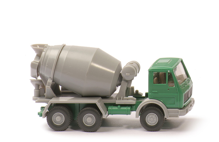 Kabine | grün | Spiegelaufnahmen | mit | Grill | eingesetzt, ohne Silberstreifen neben Stern | Verglasung | klar | Inneneinrichtung | Lenkrad integriert, ca. graubeige | Stoßstange, vorderer Kotflügel | silbergrau | Typ vorderer Kotflügel | mit Wulst, mit Blinkern | Scheinwerfer | unbemalt, mit integrierten Blinkern | Chassis | grün | Kardanelement | grün | Bodenprägung | WIKING, Berlin-W | Auspuff-Aufnahme | mit, 2 mm | stehender Auspuff | ohne | Aufbau mit Kotflügeln | silbergrau | Trommel | silbergrau | schwenkbare Schütte | silbergrau | Beschriftung der Trommel | ohne | Räder | 12 mm, Felge eingesetzt | Felgen | 6-Loch, silbergrau |
