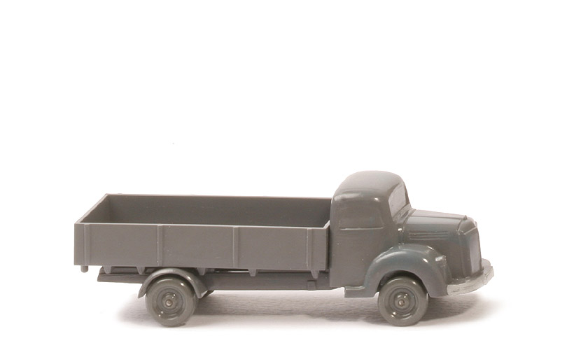 Achsen | Rollachser | Farbe Kabine u. Chassis | basaltgrau | Kabinenboden | offen, hier Prägung M | Innenprägung | M | Grill | glatt | Bemalung Kabine | Scheinwerfer, Stoßstange | Pritsche | Seiten glatt, keine Kante oben | Farbe Pritsche | basaltgrau | Zughaken | nach unten | Zapfen | Rundzapfen | Befestigung Pritsche | geklebt | Räder | 10mm, ohne Profil |