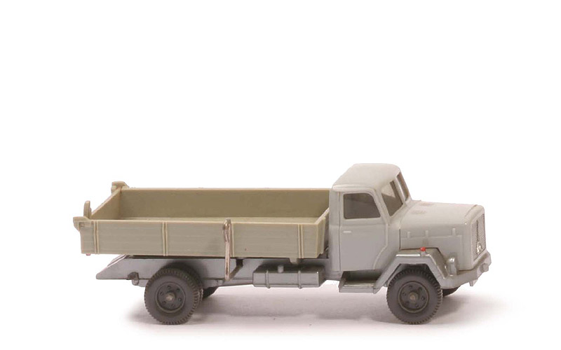 | Farbe Kabine | silbergrau | | Verglasung | getönt | | Bemalung vorn | Scheinwerfer silbern, Blinker rot | | Chassis Farbe | silbern | | Chassis Art | Version 3 | | hinterer Chassisbereich | geschlossen | | Chassis Bodenprägung | WM | | Abdeckplatte des Kipphebels | silbern | | Kippscharnier | silbern | | Pritsche Art | Flachbord ohne Wulst | | Pritsche Farbe | silbergrau vergilbt | | bewegliche Heckklappe | silbergrau vergilbt | | Rückleuchten und Kennzeichen | an Pritsche | | Bemalung hinten | Rückleuchten rot | | Kipphebel | auf Beifahrerseite | | Räder | 11mm, einteilig anthrazit |