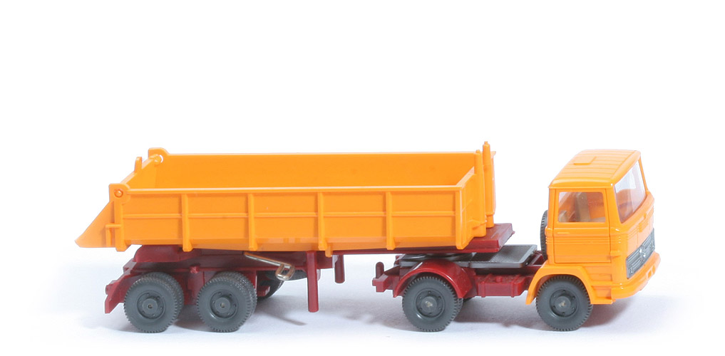 | Zugmaschine | Farbe Kabine | orangegelb | Spiegel | ohne | Verglasung | klar | Inneneinrichtung | ca. zementgrau | Lenkrad | ohne | Grill | silbern mit Stern | Reserverad | hinter Kabine | Farbe Chassis | rubinrot | Sattelpfanne | für großen Königsbolzen | Radlauf hinten | rubinrot | Zughaken | einfach | Räder | 11mm, einteilig, Profil fein | | Auflieger | Farbe Mulde und Klappe | orangegelb | Farbe Chassis | rubinrot | Bodenprägung Chassis | Wiking Germany | Farbe Scharnierhalterung | rubinrot | Farbe Achshalterung | rubinrot | Bodenprägung Achshalterung | 67 S | Königsbolzen | stark | Reserverad | unter Chassis | Räder | 11mm, einteilig, Profil fein |