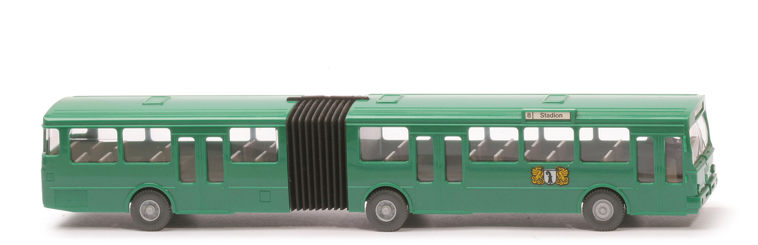 Farbe Karosserie | dunkelgrün | Bemalung vorne | Scheinwerfer silbern | Verglasung | klar | Gelenkbereich | schwarzer Weichkunststoff | Sitze | ca. graubeige | Fahrer | ca. basaltgrau | Fahrer Typ | Standard-Busfahrer | Bemalung Fahrer | Gesicht | Lenkrad | anthrazit | Bemalung Heck | ohne | Chassis Farbe | anthrazit | Chassis Typ | mit Trapez | Bodenprägung | WIKING, Berlin-W | Räder | 12mm, Profil grob, 10-Loch-Felgen | Felgen | silbergrau | Zielangaben | 8 | Stadion | Beschriftung | Stadtwappen Basel | Beschriftung Art | Druck |