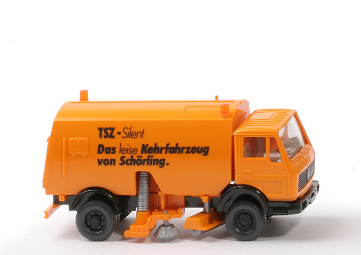 | Kabine | orangegelb | | Spiegelaufnahmen | ohne | | Grill | eingesetzt, schwarz | | Grillbedruckung | nur Stern | | Inneneinrichtung mit Lenkrad | ca. zementgrau | | Kotflügel | schwarz mit Wulst | | Chassis | schwarz | | Bodenprägung | WIKING BERLIN-W | | Radlauf hinten | schwarz | | kippbarer Aufbau | orangegelb | | Unterbau | orangegelb | | Aufnahme des Haltestiftes | silbern | | Walze, Bürste, Saugschlauch | silbern | | Beschriftung | TSZ-Silent (..s. Foto) | | Bemalung | ohne | | Räder | 11 mm | | Felgen | eingesetzt, schwarz, 8 Loch |