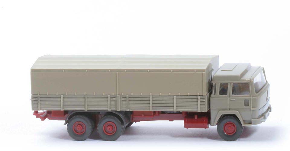 | Kabine oben | olivgrau | | Kabine unten | olivgrau | | Verglasung | klar | | Inneneinrichtung | ca. lichtgrau | | Lenkrad | ohne | | Grill | silber | | Chassis Farbe | hellbraunrot | | Radlauf hinten | anthrazit, 1-teilig | | Bodenprägung | vorne: Germany, hinten: 47m | | Reserverad | unter Pritsche | | Pritsche | olivgrau | | Pritscheneinlage | ca. betongrau | | Plane | offen | | Farbe Plane | hellgelbgrau | | Räder | 12mm, Profil fein | | Felgen | hellbraunrot |
