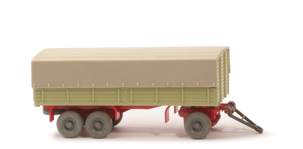 | Pritsche | Farbe | lindgrün | Rückleuchten | mit | Herstellerkennzeichnung | WM / Germany | | Chassis | Farbe | rot | Achshalterungen | offen | Drehschemel | eingesteckt | Deichsel | beweglich, angesteckt, Kunststoff | | Plane | Plane Typ | hinten offen | Plane Farbe | hellgelbgrau | | weitere Details | Bemalung Nummernschild | ohne | Räder Typ | 12mm, mit Profil | Räder Farbe | ca. staubgrau |