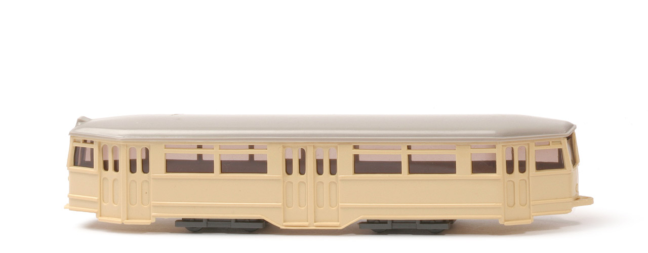 | Karosserie Farbe | hellbeige | | Karosserie Bodenprägung | WIKING, Berlin-W | | Zughakenloch vorne | ohne Schlitz | | Kupplungsöse Metall | ohne | | Verglasung | rötlich getönt | | Farbe Dach | graubeige | | Acheinheiten Typ | mit seitlicher Verstärkung | | Achseinheiten Bodenprägung | WM | | Achseinheiten Farbe | anthrazit | | Rader Typ | Scheibenräder mit mittigem Steg | | Räder Farbe | anthrazit | | Bemalung | ohne | | Beschriftung | ohne |