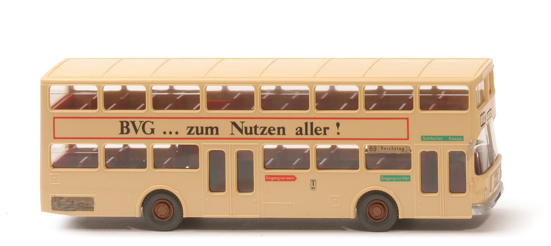 Farbe Aufbau | hellbeige | Farbe Inneneinrichtung | dunkelrot | Fahrer | ca. basaltgrau | Lenkrad | anthrazit | Farbe Chassis | anthrazit | Bodenprägung | WIKING BERLIN-W | Beschriftung Art | Druck | Beschriftung | BVG ... zum Nutzen aller ... siehe Foto | Schrift über Tür vorn | grün, Negativdruck | Schrift hinter Vordertür | grün, Negativdruck | Schrift vor hinterer Tür | rot, Negativdruck | BVG-Emblem | beidseits | Zielangaben | hier: nachträglich 69 | sonstige Bemalung | hier: nachträglich umfangreich | Räder | 12 mm | Radkappen | lehmbraun |