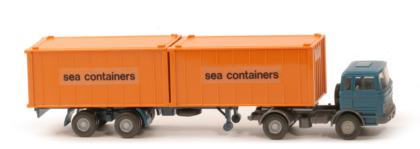 | Zugmaschine | Kabine oben | azurblau | Kabine unten | azurblau | Streifen | ohne | Verglasung | klar | Inneneinrichtung | ca. lichtgrau | Lenkrad | ohne | Grill | silbern | Stoßstange, Radlauf vorn | basaltgrau | Chassistyp | neu | Chassisfarbe | basaltgrau | Radlauf hinten | basaltgrau | Reserverad | hinter Kabine | Sattelpfanne | für großen Königsbolzen | Räder | 12mm, Profil fein | Felgen | silbergrau | | Container | Art | 2 x 20 ft gerippt | Dach | gelborange | Korpus | gelborange | Türen | gelborange | Beschriftung | Sea Containers (s. Foto) | Beschriftung Grösse | Folie | | Auflieger | Farbe | ozeanblau | Unterfahrschutz | ohne | Königsbolzen | stark | Räder | 12mm, Profil fein | Felgen | silbergrau |