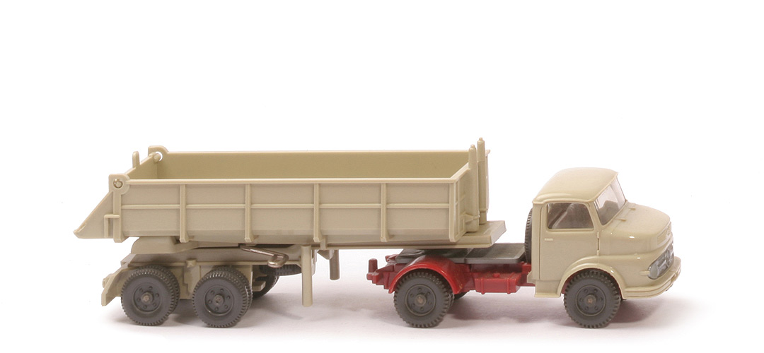 | Zugmaschine | Farbe Kabine | hellgelbgrau | Lüfter | ohne - Dach glatt | Eckfenster | immer ohne | Blinker | immer neben Scheinwerfern | Inneneinrichtung | ca. silbergrau | Verglasung | leicht getönt | Chassis | hellbraunrot | Radlauf hinten | hellbraunrot | Sattelpfanne | neu, für dünnen Bolzen | Reserverad | hinter Kabine, Profil fein | Räder | 11mm, einteilig, Profil grob | | Auflieger | Farbe Mulde und Klappe | hellgelbgrau | Farbe Chassis | hellgelbgrau | Bodenprägung Chassis | Wiking Germany | Farbe Scharnierhalterung | hellgelbgrau | Farbe Achshalterung | hellgelbgrau | Bodenprägung Achshalterung | 67 S | Königsbolzen | dünn, integriert | Reserverad | unter Chassis, Profil fein | Räder | 11mm, einteilig, Profil fein |