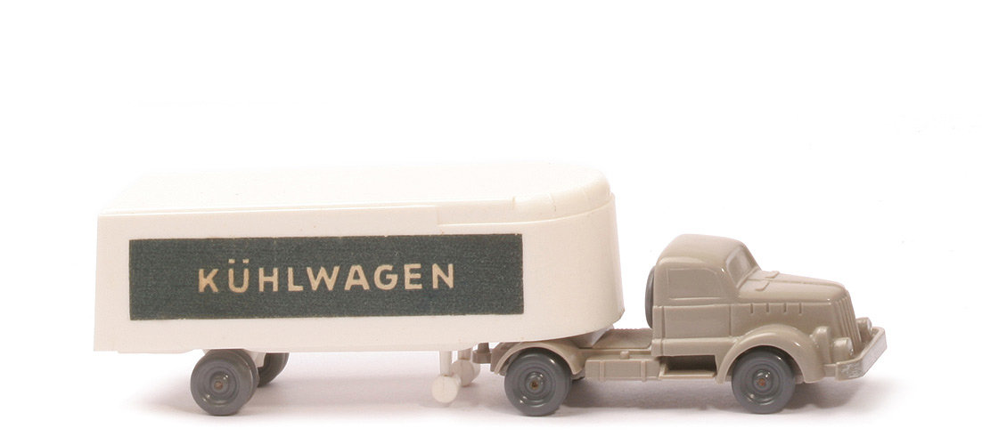 Achsen | Rollachser | Farbe Kabine | braunelfenbein | Farbe Chassis | braunelfenbein | Bemalung | Scheinwerfer, Kennzeichen silbern | Sattelpfanne | eingesetzt, in Chassisfarbe | Chassis | Version 1b | Achshalterungen | geschlossen | Bodenprägung | WM im Kreis | Reserverad | hinter Kabine | Räder | 10mm, ohne Profil, dunkelbasaltgrau | | Auflieger | Farbe Oberteil | weiß | Farbe Unterteil | weiß | Radlauf | ohne Kotflügel | Bodenprägung | WM im Kreis | Rückleuchten | ohne | Dach | glänzend | Aufkleberart | Papier, matt | Beschriftung | Kühlwagen (s. Foto) | Beschriftung Farbe | stahlblau mit weißer Schrift | Räder | 10mm, ohne Profil, dunkelbasaltgrau |