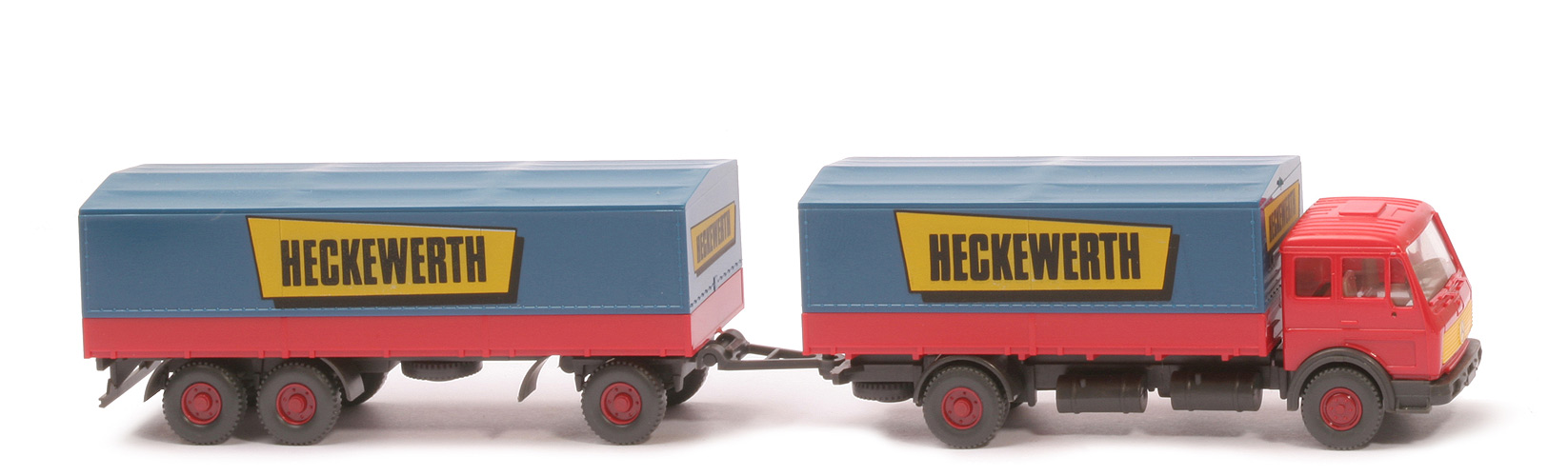 | Zugwagen | Kabine | orangerot | eingesetzter Grill | gelb, ohne Streifen | Lüfter | hoch | Heckfenster | geschlossen | Spiegelaufnahmen | mit | Inneneinrichtung | ca. hellolivgrau | Stoßstange | anthrazit | Chassis | anthrazit | Bodenprägung Chassis | WIKING, Berlin-W | Radlauf hinten | anthrazit | Reserverad | hinten unter Chassis | Pritsche | orangerot | Pritscheneinlage | Pappe, silbern | Plane | capriblau | Beschriftung | Heckewerth ... (s. Foto) | Räder | Profil grob | Felgen | hellbraunrot, 6-Loch | | Anhänger | Pritsche | orangerot | Chassis | anthrazit | Bodenprägung Chassis | WIKING, Berlin-W | Doppelachsaggregat | anthrazit | Drehschemel | anthrazit | Pritscheneinlage | Pappe, silbern | Plane | capriblau | Beschriftung | Heckewerth ... (s. Foto) | Räder | Profil grob | Felgen | hellbraunrot, 6-Loch |