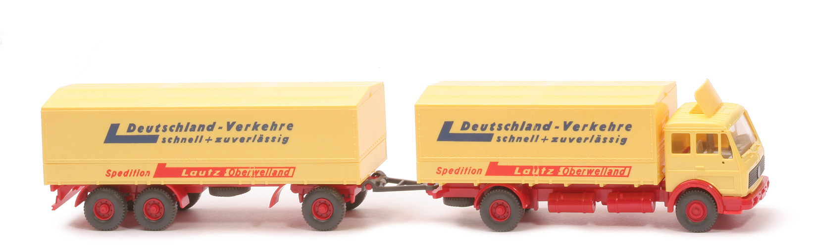 | Zugwagen | Kabine | hellgelb | eingesetzter Grill | schwarz, ohne Streifen | Spoiler | hellgelb | Heckfenster | geschlossen | Spiegelaufnahmen | mit | Inneneinrichtung | ca. hellolivgrau | Stoßstange | rot | Chassis | rot | Bodenprägung Chassis | WIKING, Berlin-W | Radlauf hinten | rot | Reserverad | hinten unter Chassis | Pritsche | hellgelb | Pritscheneinlage | Pappe, weiß mit dünnen schwarzen Längsstreifen | Plane | hellgelb | Beschriftung | Lautz-Oberwendland ... (s. Foto) | Räder | Profil grob | Felgen | rot, 8-Loch | | Anhänger | Pritsche | hellgelb | Chassis | rot | Bodenprägung Chassis | WIKING, Berlin-W | Doppelachsaggregat | rot | Drehschemel | rot | Pritscheneinlage | Pappe, weiß mit dünnen schwarzen Längsstreifen | Plane | hellgelb | Beschriftung | Lautz-Oberwelland ... (s. Foto) | Räder | Profil grob | Felgen | rot, 8-Loch |