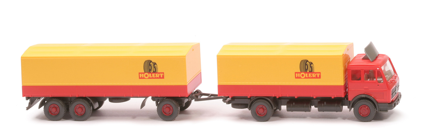 | Zugwagen | Kabine | orangerot | eingesetzter Grill | schwarz, mit Streifen | Spoiler | silbern | Heckfenster | offen | Spiegelaufnahmen | mit | Inneneinrichtung | ca. hellolivgrau | Stoßstange | anthrazit | Chassis | anthrazit | Bodenprägung Chassis | WIKING, Berlin-W | Radlauf hinten | anthrazit | Reserverad | hinten unter Chassis | Pritsche | orangerot | Pritscheneinlage | Pappe, weiß mit dünnen schwarzen Längsstreifen | Plane | gelb | Beschriftung | Holert ... (s. Foto) | Räder | Profil grob | Felgen | hellbraunrot, 6-Loch | | Anhänger | Pritsche | orangerot | Chassis | anthrazit | Bodenprägung Chassis | WIKING, Berlin-W | Doppelachsaggregat | anthrazit | Drehschemel | anthrazit | Pritscheneinlage | Pappe, weiß mit dünnen schwarzen Längsstreifen | Plane | gelb | Beschriftung | Holert ... (s. Foto) | Räder | Profil grob | Felgen | hellbraunrot, 6-Loch |