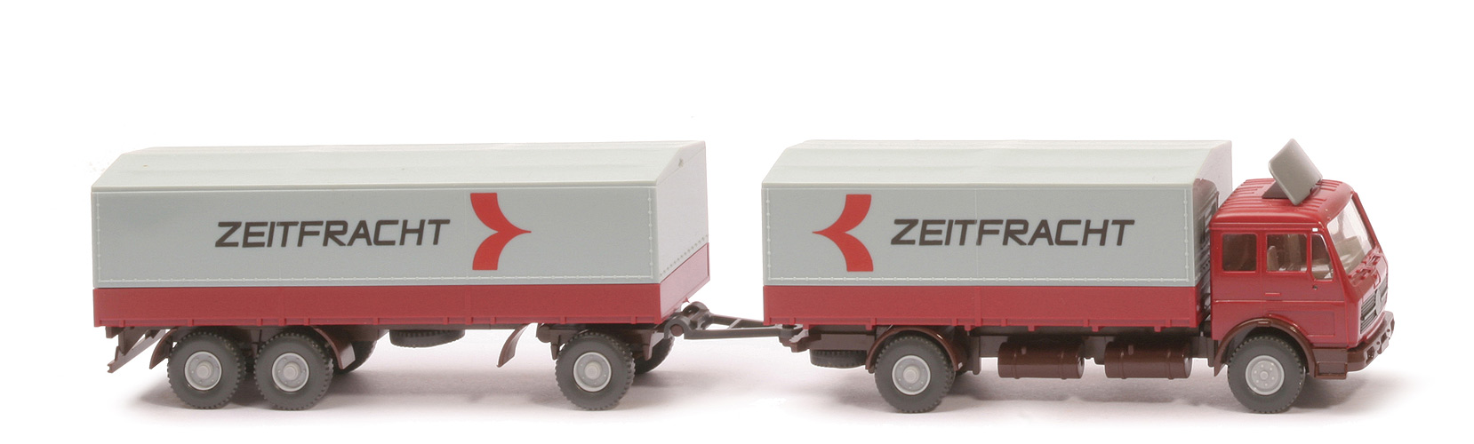 | Zugwagen | Kabine | rubinrot | eingesetzter Grill | schwarz, mit Streifen | Spoiler | silbern | Heckfenster | geschlossen | Spiegelaufnahmen | mit | Inneneinrichtung | ca. hellolivgrau | Stoßstange | schokobraun | Chassis | schokobraun | Bodenprägung Chassis | WIKING, Berlin-W | Radlauf hinten | schokobraun | Reserverad | hinten unter Chassis | Pritsche | rubinrot | Pritscheneinlage | Pappe, weiß mit dünnen schwarzen Längsstreifen | Plane | hellblaugrau | Beschriftung | Zeitfracht ... (s. Foto) | Räder | Profil grob | Felgen | silbergrau, 6-Loch | | Anhänger | Pritsche | rubinrot | Chassis | schokobraun | Bodenprägung Chassis | WIKING, Berlin-W | Doppelachsaggregat | schokobraun | Drehschemel | schokobraun | Pritscheneinlage | Pappe, weiß mit dünnen schwarzen Längsstreifen | Plane | hellblaugrau | Beschriftung | Zeitfracht ... (s. Foto) | Räder | Profil grob | Felgen | silbergrau, 6-Loch |