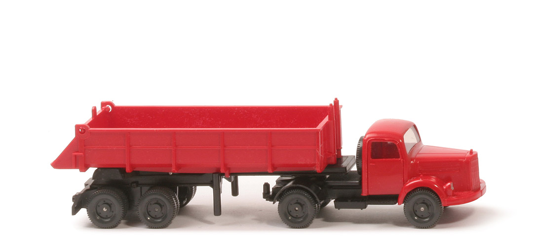| Zugmaschine | Farbe Kabine | rot | Schlitz | mit Teilung | Bemalung | nur Scheinwerfer | Dach | ohne Lüfter | Blinker | mit | Reserverad | hinter Kabine | Chassis | schwarz, Version 4 | Sattelpfanne | für großen Königsbolzen, schwarz | Achshalterungen | offen | Bodenprägung | WM und Made in Germany | Zughaken | Dreieck | Räder | 11mm, einteilig, Profil fein | | Auflieger | Farbe Mulde und Klappe | rot | Farbe Chassis | schwarz | Bodenprägung Chassis | neues WIKING-Logo | Farbe Scharnierhalterung | schwarz | Kipphebel | nur auf der Fahrerseite | Farbe Achshalterung | schwarz | Bodenprägung Achshalterung | 67 S | Königsbolzen | groß, Weichzapfen | Reserverad | ohne | Räder | 11mm, einteilig, Profil fein |