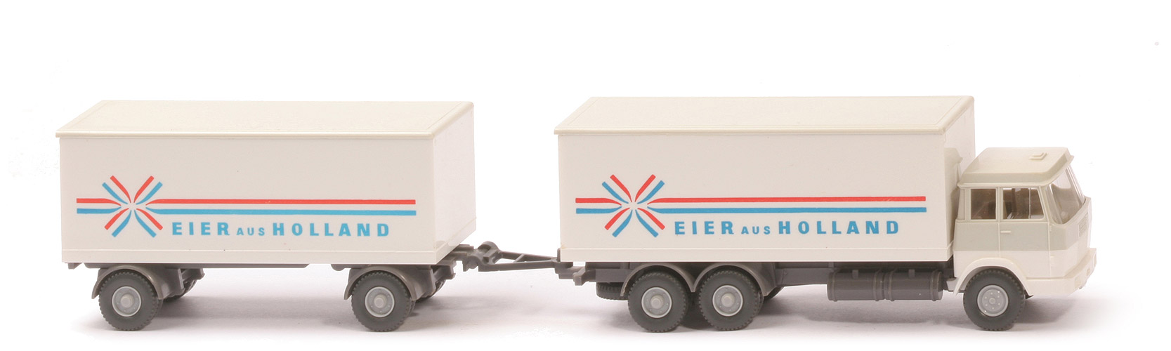 | Zugwagen | Kabine oben | grauweiß | Kabine unten | weiß | Verglasung | klar | Inneneinrichtung | 2 Sitze, Motorblock, ca. gelbgrau | Lenkrad | ohne | Scheinwerfer | unbemalt | Koffer Korpus | weiß | Koffer Dach | grauweiß | Koffer Türen | weiß | Druck | Eier aus Holland (s. Foto) | Chassis | basaltgrau | Radlauf hinten | basaltgrau, 2-teilig | Räder | Profil grob | Felgen | silbergrau | | Hänger | Koffer Korpus | weiß | Koffer Dach | grauweiß | Koffer Türen | weiß | Chassis | basaltgrau | Radläufe | basaltgrau | Druck | Eier aus Holland (s. Foto) | Räder | Profil grob | Felgen | silbergrau |