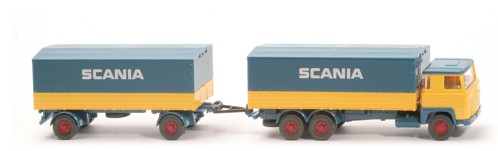 | Zugwagen | Kabinendach | azublau | Kabine oben | gelb | Kabine unten | gelb | Stoßstange | azurblau | Frontbeschriftung | SCANIA, geprägt | Scheinwerfer | 2, ungesilbert | Spiegel | mit | Scheibenwischer | ohne | Lenkrad | mit | Chassis | azurblau | Radlauf hinten | 2-teilig | Pritsche | gelb | Plane | azurblau | Räder | 12mm, Profil grob | Felgen | hellbraunrot | | Hänger | Pritsche | gelb | Chassis | azurblau | Plane | azurblau | Druck | SCANIA (s. Foto) | Pritscheneinlagen | silber | Räder | 12mm, Profil grob | Felgen | hellbraunrot |