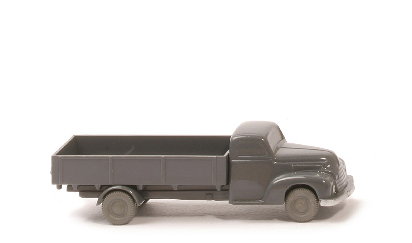 Achsen | Rollachser | Farbe Kabine u. Chassis | dunkelbasaltgrau | Kabinenboden | Platte silbern | Bodenplatte Prägung | WM im Kreis | Bemalung Kabine | Scheinwerfer, Stoßstange | Pritsche | Seiten glatt | Farbe Pritsche | dunkelbasaltgrau | Zughaken | nach unten | Zapfen | Flachzapfen | Befestigung Pritsche | geklebt | Räder | 10mm, ohne Profil |