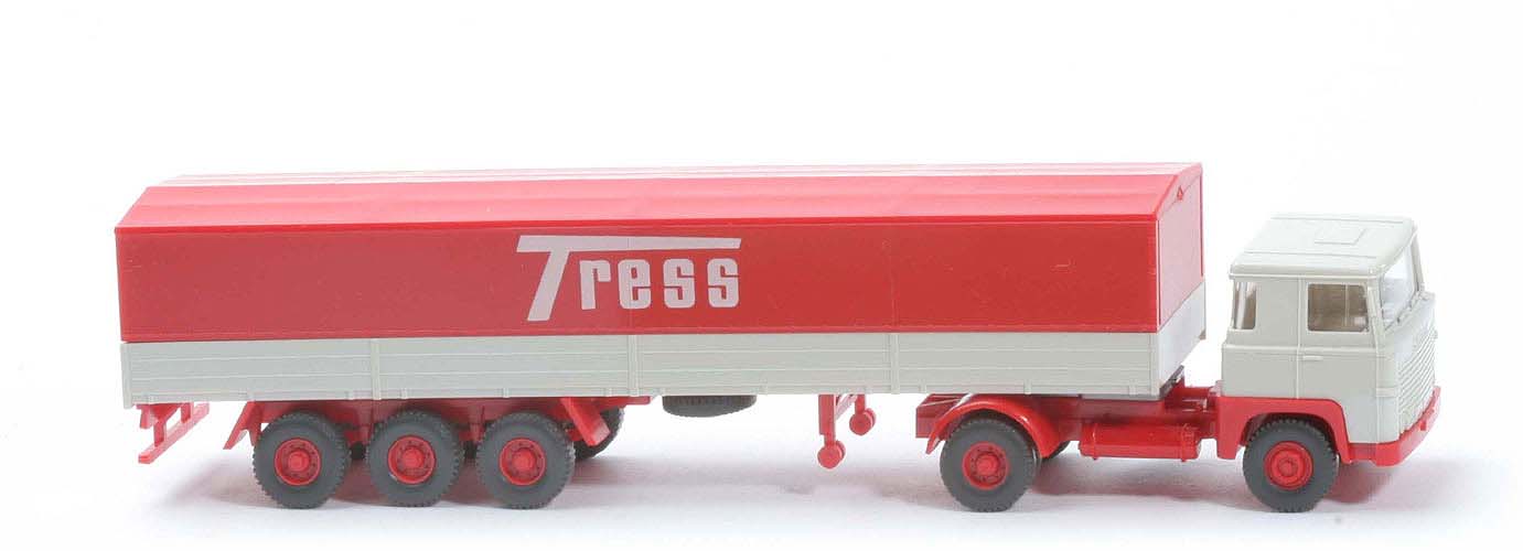 | | Zugmaschine | | Dach | grauweiß | | Kabine oben | grauweiß | | Kabine unten | grauweiß | | Stoßstange | rot | | Scheinwerfer | 2, ungesilbert | | Spiegel | mit | | Scheibenwischer | mit | | Lenkrad | mit | | Sattelpfanne | für großen Königsbolzen | | Reserverad | unter Chassis | | Chassis Farbe | rot | | Räder | 12mm, Profil grob | | 8-Loch-Felgen | rot | | | Auflieger | | Art | 4-fach-Teilung | | Farbe Pritsche | grauweiß | | Pritscheneinlage | Papier, silber | | Plane | rot | | Beschriftung Seite | Tress | | Beschriftung hinten | Tress | | Chassis | rot | | Kotflügel | gerade | | Unterfahrschutz | mit | | Königsbolzen | stark | | Räder | 12mm, Profil grob | | 8-Loch-Felgen | rot |