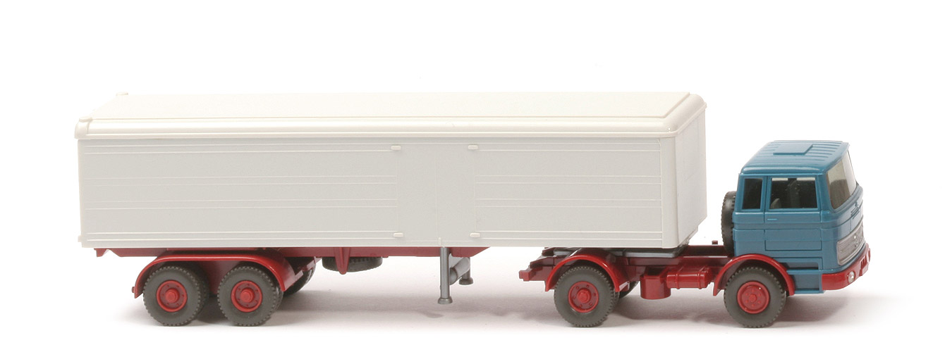| Zugmaschine | Kabine oben | azurblau | Kabine unten | azurblau | Streifen | ohne | Verglasung | getönt | Inneneinrichtung | ca. lichtgrau | Lenkrad | ohne | Grill | silbern | Stoßstange, Radlauf vorn | hellbraunrot | Chassistyp | neu | Chassisfarbe | hellbraunrot | Radlauf hinten | hellbraunrot | Reserverad | hinter Kabine | Sattelpfanne | für großen Königsbolzen | Räder | 12mm, Profil grob | Felgen | hellbraunrot | Beschriftung Kabine | ohne | | Auflieger | Kofferdach | altweiß | Koffer Korpus | altweiß | Türen | altweiß | Kühlaggregat | ohne | Chassis | hellbraunrot | Achseinheit | hellbraunrot | Beschriftung Seite | ohne | Räder | 12mm, Profil grob | Felgen | hellbraunrot |