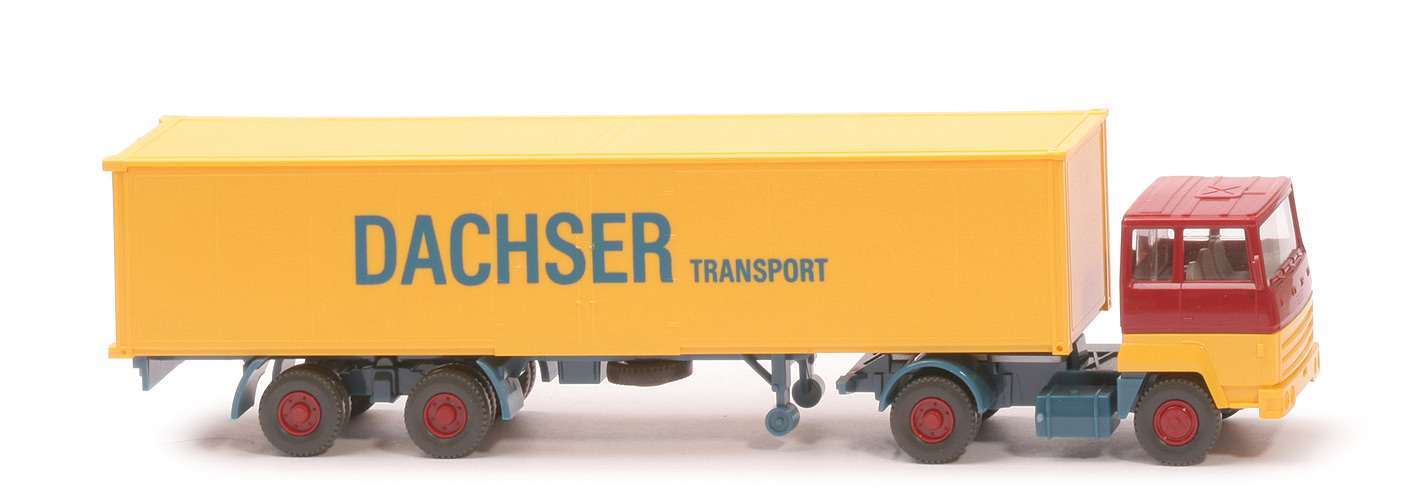 | Zugmaschine | Fahrerhaus Typ | Version 1 | Kabine oben | rubinrot | Kabine unten | gelb | Verglasung | klar | Inneneinrichtung | ca. graubeige, Lkr integriert | Chassis | azurblau, einfache Halterung der Sattelpfanne | Bodenprägung | WIKING Berlin-W | Sattelpfanne | für großen Königsbolzen | Radlauf hinten | azurblau | | Kofferauflieger | Art | mit Seitentür-Andeutung | Dach | gelb | Korpus | gelb | Türen | gelb | Beschriftung beidseits | Dachser Transport | Beschriftung Art | Druck azurblau | Chassis Typ | Schwingachsen, wie Container-Trailer | Chassis Farbe | azurblau | Unterfahrschutz | ohne | | Räder | Typ | 12mm, Profil grob | Felgen | 6-Loch, hellbraunrot |