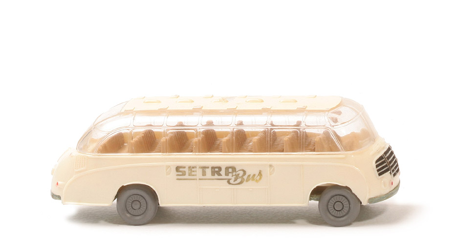 Hierbei soll es sich um ein Mustermodell handeln. Die Karosserie entspricht dem frühen Werbemodell ohne den großen Hecklüfter. Auch das Dach ist wie bei den späteren Werbe-Modellen ausgeführt. Die seitliche Gestaltung weicht von den späteren Werbemodellen ab: keine Schablonierung, dafür auf der Beifahrerseite ein wunderschöner gedruckter Schriftzug in der Art des Aufgeklebten - nur etwas größer. Die Fahrerseite hat keinen Schriftzug und keine Schablonierung. Die Inneneinrichtung stammt vom Trambus mit Glasdach und ist eingeklebt. Das glatte Chassis stammt vom frühen Pullman-Bus und wurde durch Zurechtfeilen angepasst. Dadurch gibt es noch keine Stoßstangen. Der Achsabstand stimmt nicht mit dem der Karosserie überein. Hier sind die "richtigen" Räder montiert, allerdings noch ohne Silberung. |