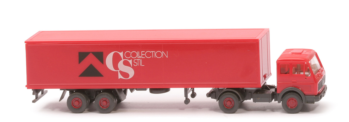 | Zugmaschine | Kabine | rot | eingesetzter Grill | schwarz, ohne Streifen | Lüfter | hoch | Heckfenster | offen | Spiegelaufnahmen | mit | Inneneinrichtung | ca. hellolivgrau | Stoßstange | dunkelbasaltgrau | Chassis | dunkelbasaltgrau | Radlauf hinten | dunkelbasaltgrau | Reserverad | ohne | Räder | Profil grob | Felgen | 6-Loch, hellbraunrot | | Auflieger | Farbe Dach | rot | Farbe Korpus | rot | Türen | rot | Beschriftung | CS Collection Stil | Beschriftung Art | Druck | Auflieger | dunkelbasaltgrau | 2-Achsaggregat Farbe | dunkelbasaltgrau | Unterfahrschutz | mit | Königsbolzen | stark | Räder | Profil grob | Felgen | 6-Loch, hellbraunrot |
