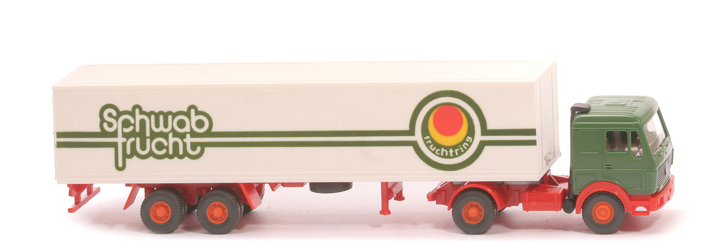| Zugmaschine | Kabine Farbe | maigrün | hintere Seitenfenster | geschlossen | Scheibenwischer | mit | Heckfenster | geschlossen | eingesetzter Grill | schwarz, mit MB-Stern, ohne Streifen | Inneneinrichtung | ca. graubeige, Lenkrad integriert | Ansaugstutzen | schwarz, hinter Kabinenrückwand | Stoßstange | orangerot | Chassis | orangerot, BP WIKING | Radlauf hinten | orangerot | Reserverad | ohne | Räder | 12 mm, Profil grob | Felgen | 8-Loch, orange | | Auflieger | Koffer Korpus | weiß | Dach | weiß | Türen | weiß | Beschriftung | Schwabfrucht ... (s. Foto) | Beschriftung Art | Druck | Chassis | orangerot | Bodenprägung | WIKING Berlin-W | Unterfahrschutz | mit | 2-Achsaggregat Farbe | orangerot | 2-Achsaggregat Typ | eingesteckt, Klipsachsen | Hydraulikstütze | orangerot, mit Stützen | Räder | 12 mm, Profil grob | Felgen | 8-Loch, orange |