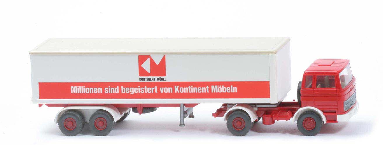 | Zugmaschine | Kabine oben | rot | Kabine unten | rot | Streifen | ohne | Verglasung | klar | Inneneinrichtung | ca. hellolivgrau | Lenkrad | mit | Grill | silbern | Stoßstange, Radlauf vorn | weiß | Chassistyp | neu | Chassisfarbe | rot | Radlauf hinten | weiß | Reserverad | hinter Kabine | Sattelpfanne | für großen Königsbolzen | Räder | 12mm, Profil grob | Felgen | hellbraunrot | | Auflieger | Kofferdach | hellelfenbein | Koffer Korpus | weiß | Türen | hellelfenbein | Chassis | rot | Achseinheit | weiß | Beschriftung Seite | Kontinent 81mm | Räder | 12mm, Profil grob | Felgen | hellbraunrot |