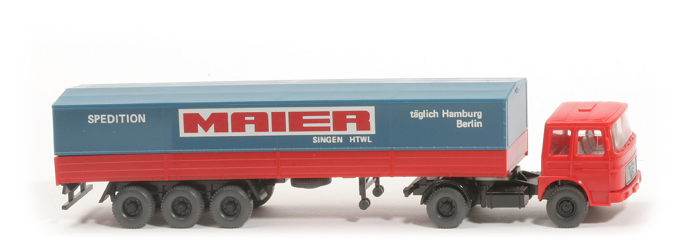 | Zugmaschine | Fahrerhaus | rot | Verglasung | klar | Inneneinrichtung | mit Lenkrad | Spiegel | mit | Scheibenwischer | mit | Lüftergitter | ohne | Grill | silbern, mit Löwe | Motorblock | silbern | Chassis | schwarz, neu | | Auflieger | Art | 4-fach-Teilung | Farbe Pritsche | rot | Pritsche Bodenprägung | Wiking, Berlin-W | Chassis | schwarz | Pritscheneinlage | Pappe, silbern | Plane | azurblau | Druck | Maier, ... (s. Foto) | Stützen | als Rollen, eingesetzt | 3-Achsaggegat Farbe | schwarz | 3-Achsaggegat Typ | Kotflügel eckig | Heck | gerade | Warndreiecke | neben Rückleuchten | Räder | 12mm, Profil grob | Felgen | 8-Loch, schwarz |